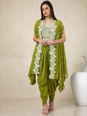 Green Floral Embroidered Round Neck Top & Patiala With Shrug